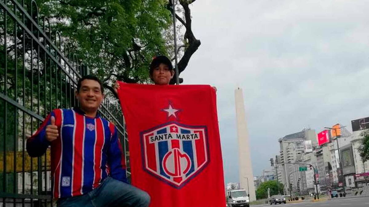 Moisés Cuellar Hernández, odontólogo egresado de la Universidad Metropolitana de Barranquilla, salió a la Avenida 9 de Julio y con el icónico obelisco en el fondo ondeó la bandera del Unión Magdalena en compañía de su hijo Ezequiel, de 11 años.
