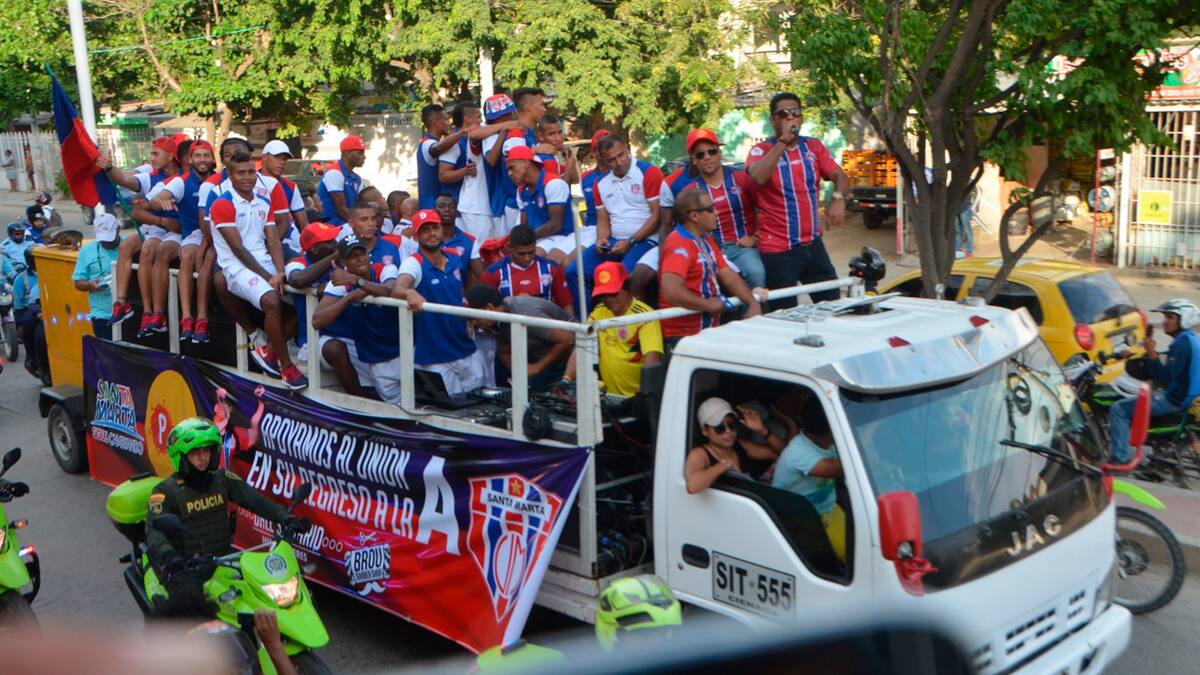 A bordo de un camión-furgón, los integrantes de la plantilla bananera iniciaron el recorrido por la ciudad, teniendo como acompañantes a cientos de simpatizantes que se unieron a la caravana en bicicleta, carros y motos con los distintivos del equipo que regresó a la A después de 13 años sumido en la segunda división.