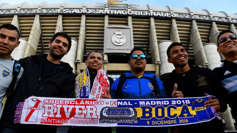 A las 2:30 p.m., hora colombiana, se disputará la final Boca VS. River por la Copa Libertadores. Los hinchas de ambos clubes empiezan a arribar al mítico estadio Santiago Bernabéu, que hoy se tiñe de rojo y azul.