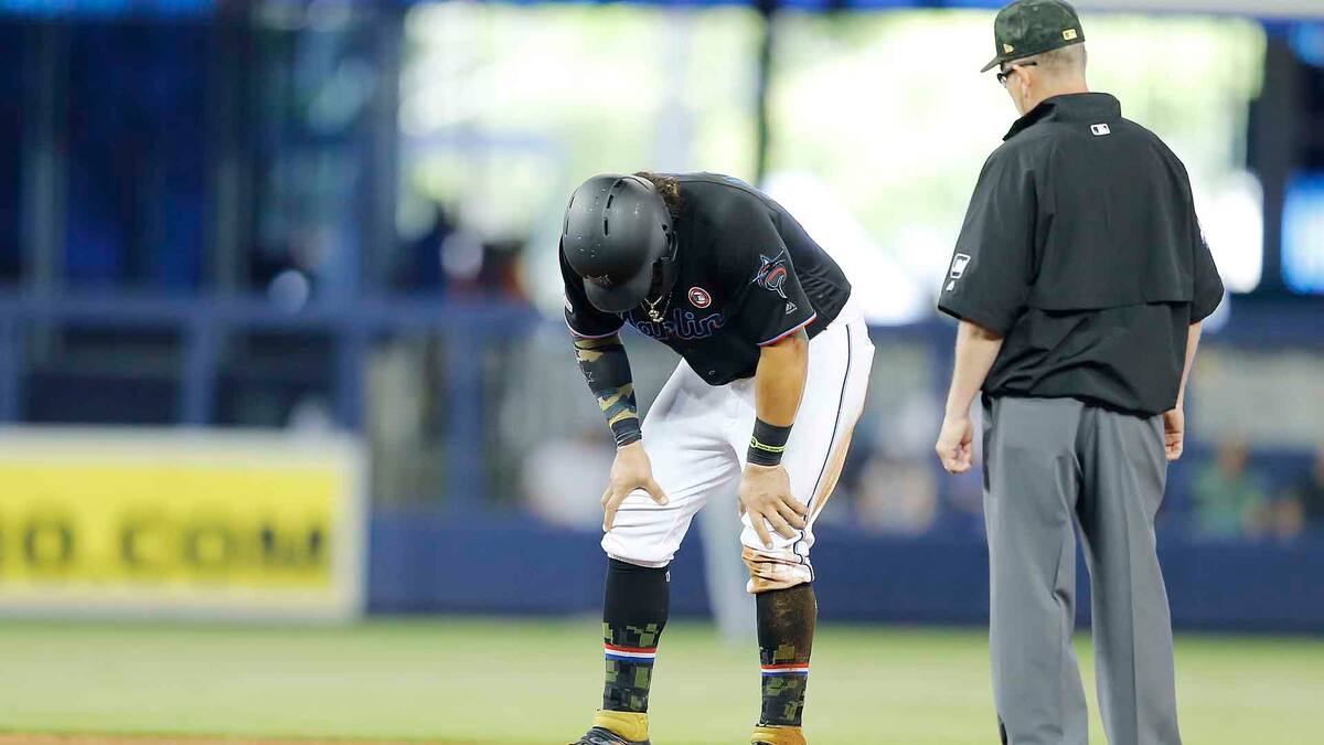 El receptor colombiano Jorge Alfaro abandonó este sábado visiblemente adolorido el juego en que su novena, los Marlins de Miami, vencieron 2-0 a los Mets de Nueva York.