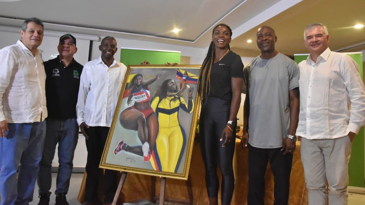 En medio de su conferencia de prensa, Caterine recibió un lienzo por parte del pintor Leonardo Aguaslimpias, quien plasmó a la deportista colombiana con su particular estilo.