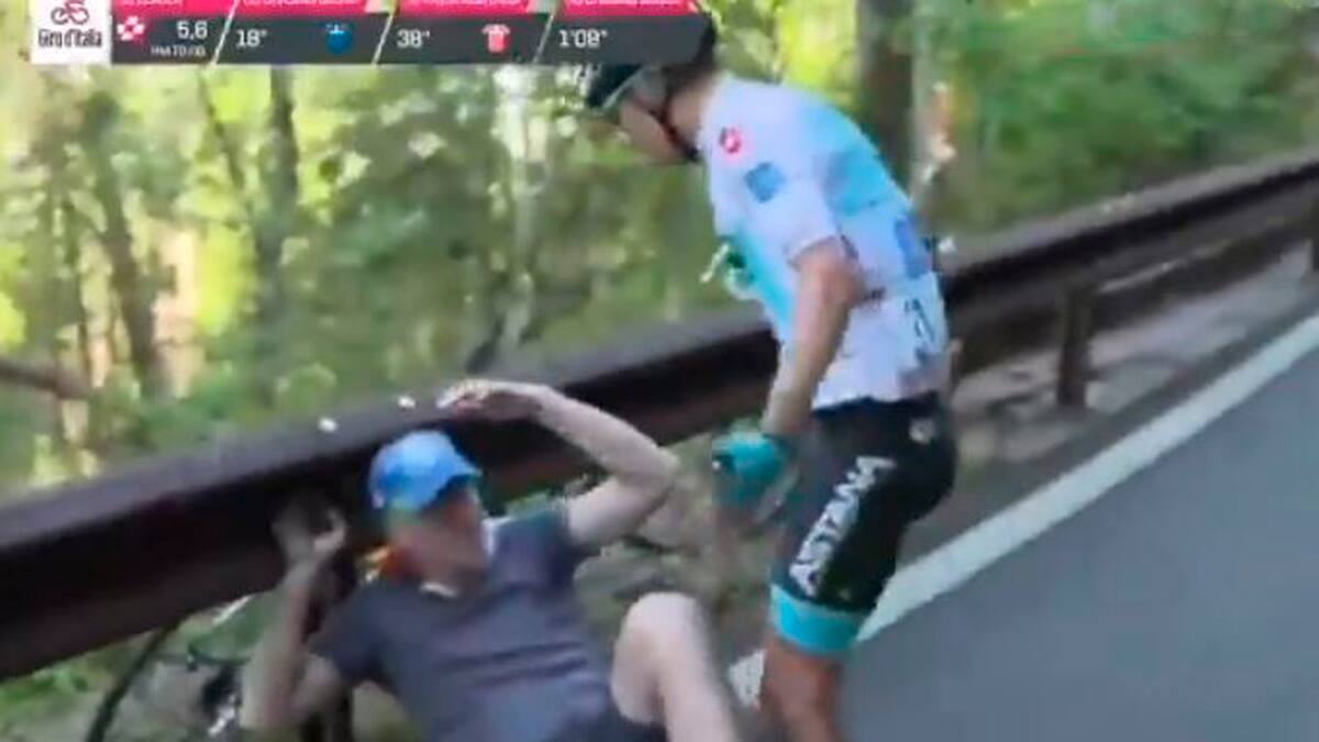 Cuando iba en el último ascenso de la etapa 20, el ciclista colombiano pedaleaba junto a un pequeño grupo que perseguía a Richard Carapaz, Mikel Landa y Vincenzo Nibali, cuando un espectador que corría muy pegado a los pedalistas lo tropezó y le provocó la caída. ‘Supermán’, enfurecido, se levantó, golpeó al hombre, le reclamó y luego retomó su marcha.