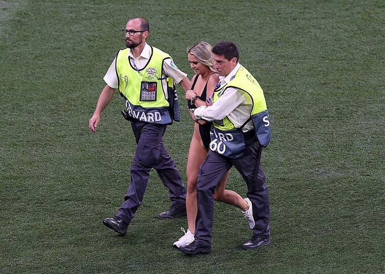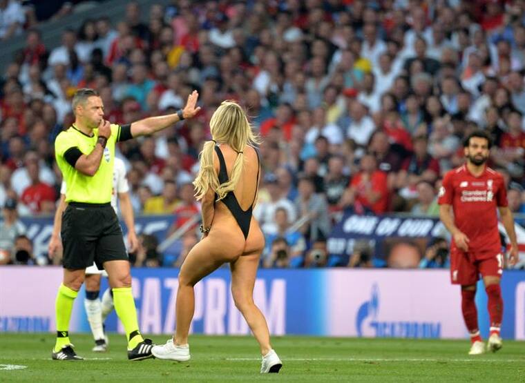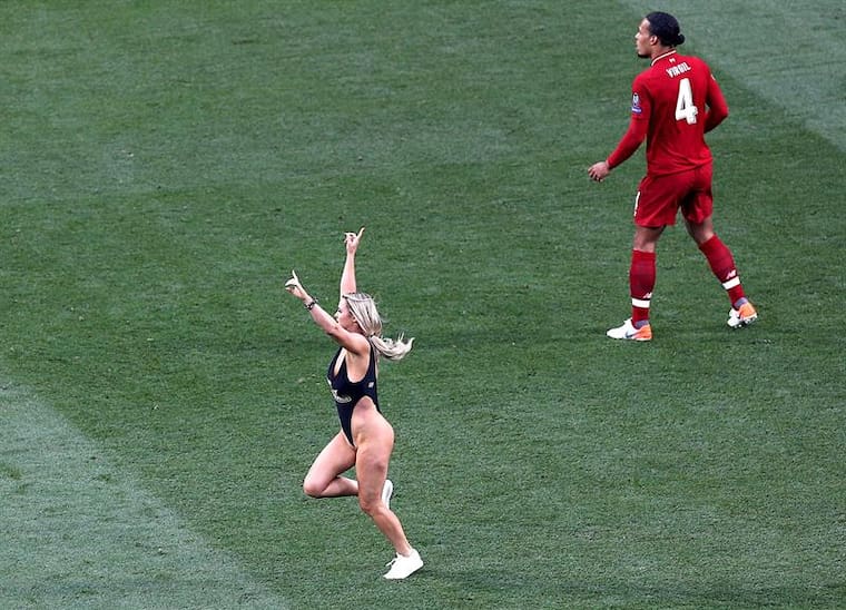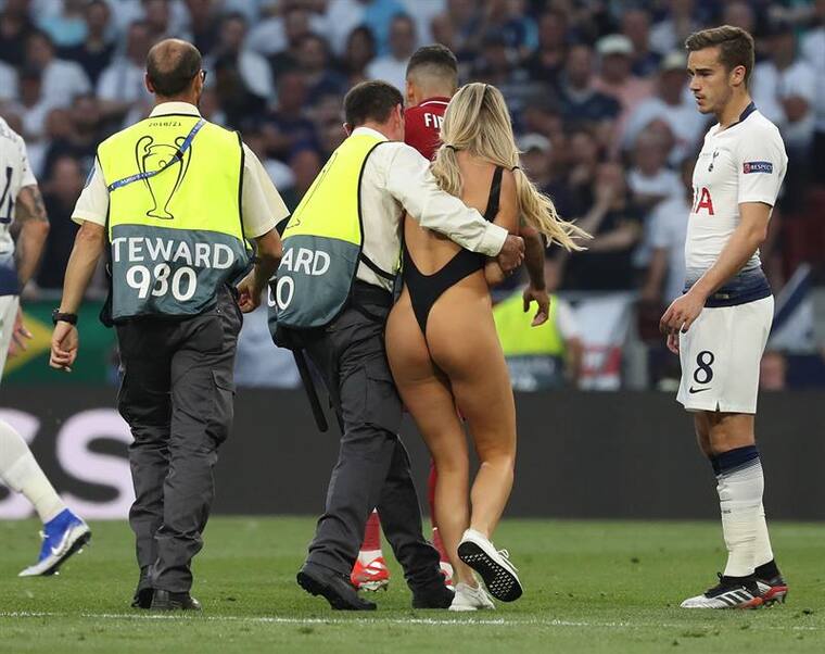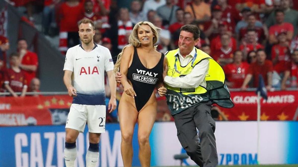 El duelo en el Wanda Metropolitano de Madrid, entre Liverpool y Tottenham, se pausó al minuto 19, debido a la invasión a la cancha que protagonizó Kinsey Wolanski, quien vestía un traje de baño para promocionar un sitio de películas para adultos.