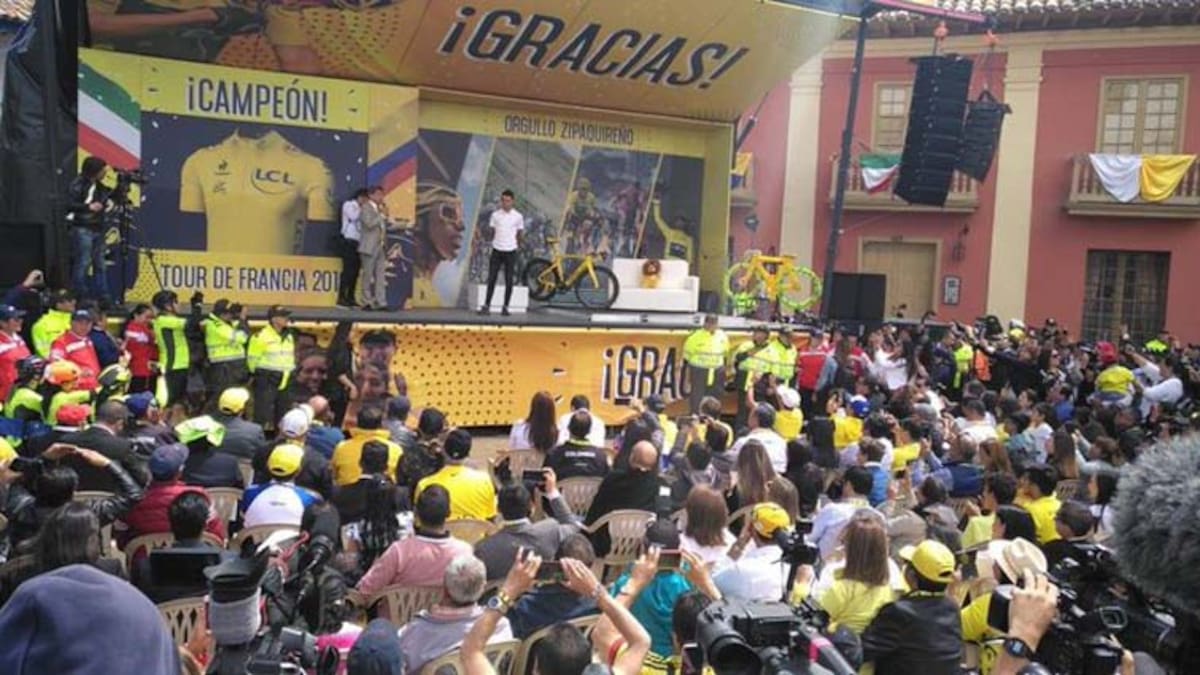 Desde las cinco de la madrugada decenas de personas se agolparon en la Plaza de los Comuneros, en el centro de la ciudad de Zipaquirá, para recibir y agradecer al primer colombiano vencedor de la prueba ciclística más importante del mundo.