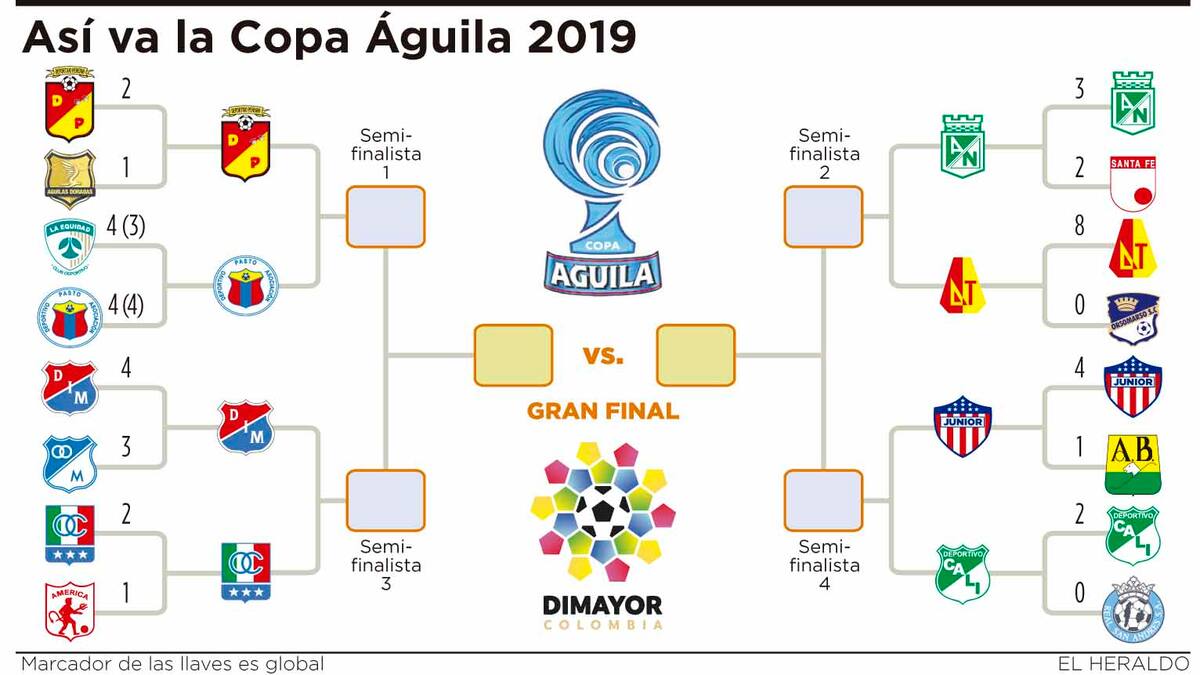 Junior vs. Cali y Atlético Nacional vs. Tolima son las dos llaves más atractivas de los cuartos de final de la Copa Águila 2019, que se completan con los duelos entre el Medellín y el Once Caldas y el Pereira con el Deportivo Pasto.
