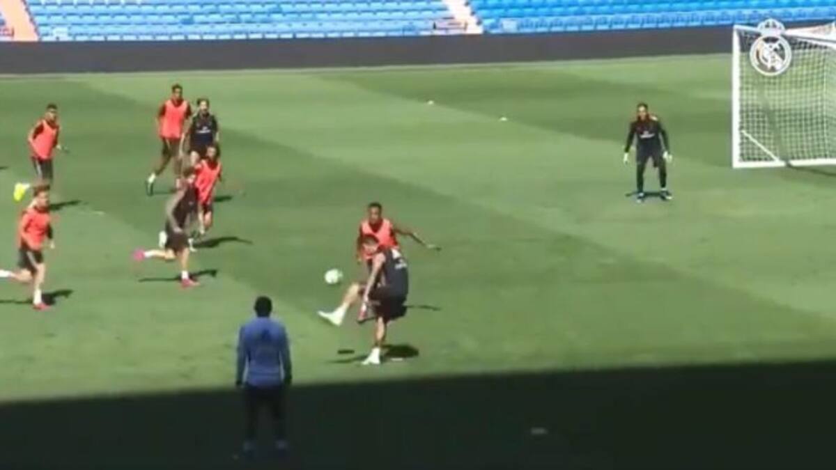 En el entrenamiento de este jueves en Valdebebas, el canal de televisión del club ‘merengue’ transmitió parte de la práctica dirigida por Zinedine Zidane, donde se pudo ver la conexión entre el colombiano y el español al construir una jugada que terminó con gol de cabeza del atacante francés.