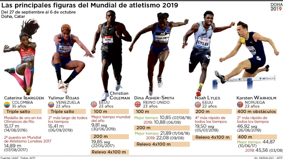 Otros grandes nombres buscan ser protagonistas en este mundial, con especial atención al triple salto femenino (la colombiana Caterine Ibargüen y la venezolana Yulimar Rojas), el salto largo masculino (el cubano Juan Miguel Echevarría) o el 400 metros vallas masculino, con el pulso a tres estelar entre el noruego Karsten Warholm, el estadounidense Rai Benjamin y el catarí e ídolo local Abderrahman Samba.