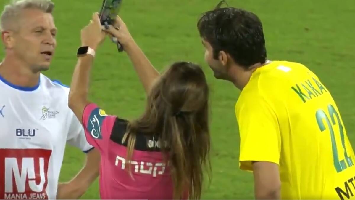 Corría el minuto 50 del partido de exhibición entre viejas glorias del fútbol brasilero contra exfiguras de Israel, cuando la juez central detuvo el encuentro y le sacó tarjeta amarilla a Kaká, en momentos en que la exestrella del AC Milán y Real Madrid avanzaba con el balón.