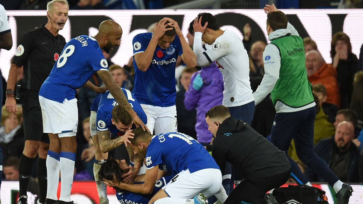 Jugadores del Everton abrazaron a Gomes hasta que una camilla se lo llevó del campo.