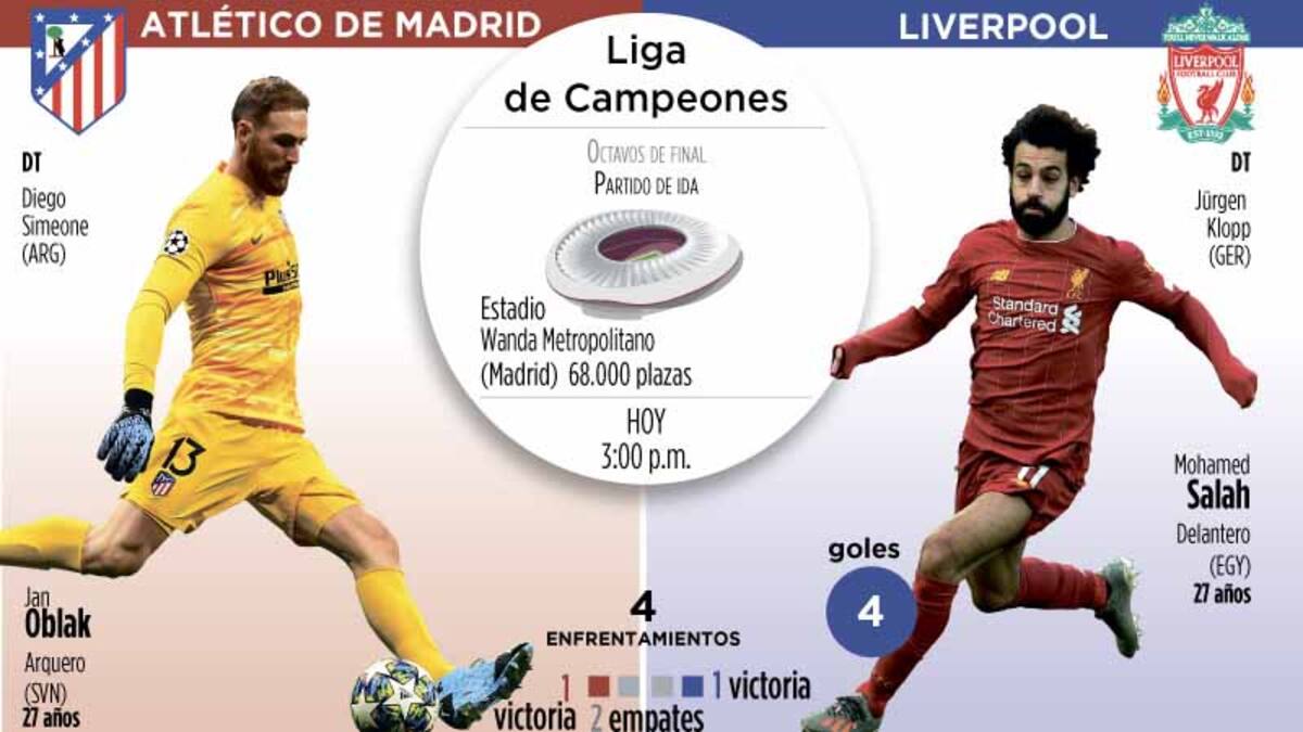 El Atlético de Madrid recibe el martes al poderoso Liverpool (3 p.m.) buscando una victoria que anime al equipo y borre las dudas sobre los 'colchoneros' en la ida de los octavos de final de la Liga de Campeones.