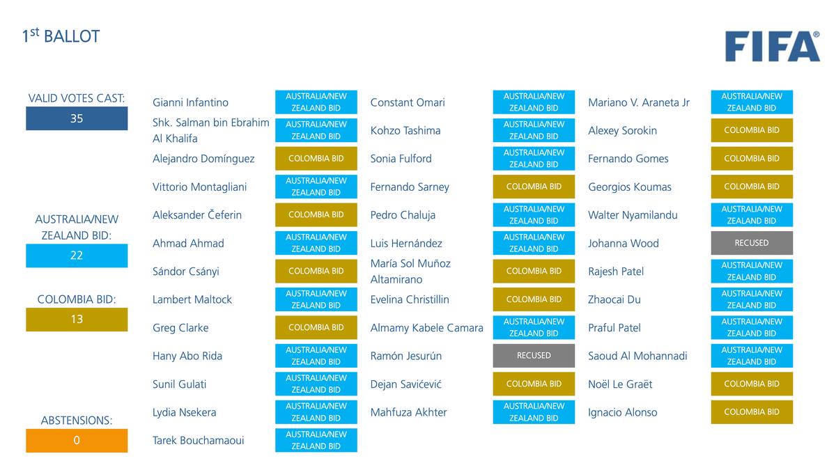 Con los cinco votos de la Concacaf, Colombia habría ganado la elección 18-17.