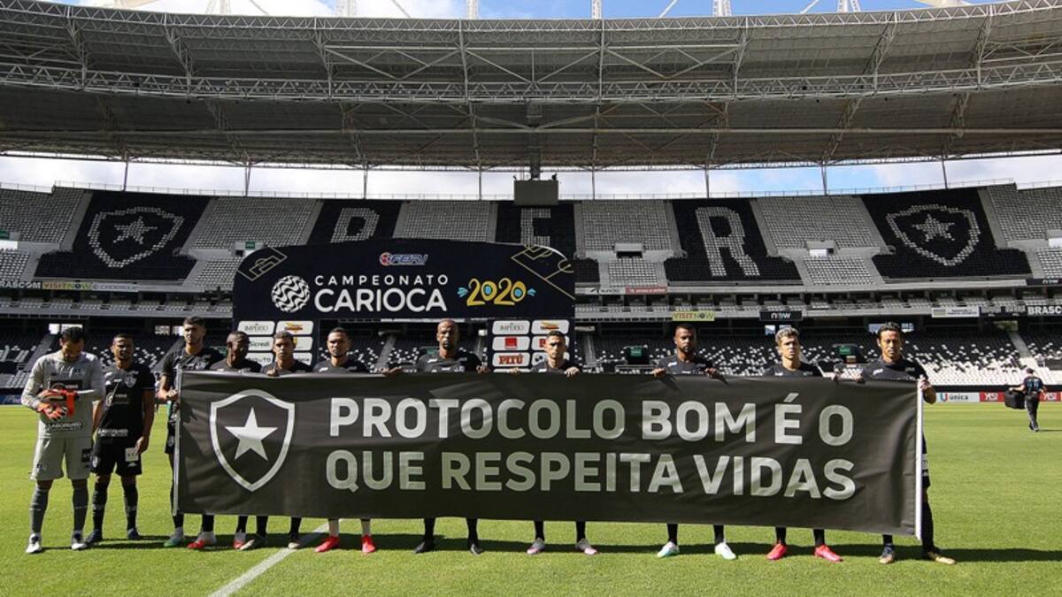 El Botafogo, uno de los clubes más tradicionales de Brasil, regresó este domingo a la cancha tras 105 días de inactividad para un partido por el Campeonato Carioca en el que protestó tanto por el reinicio del fútbol en Río de Janeiro en medio de la pandemia del coronavirus como contra el racismo.