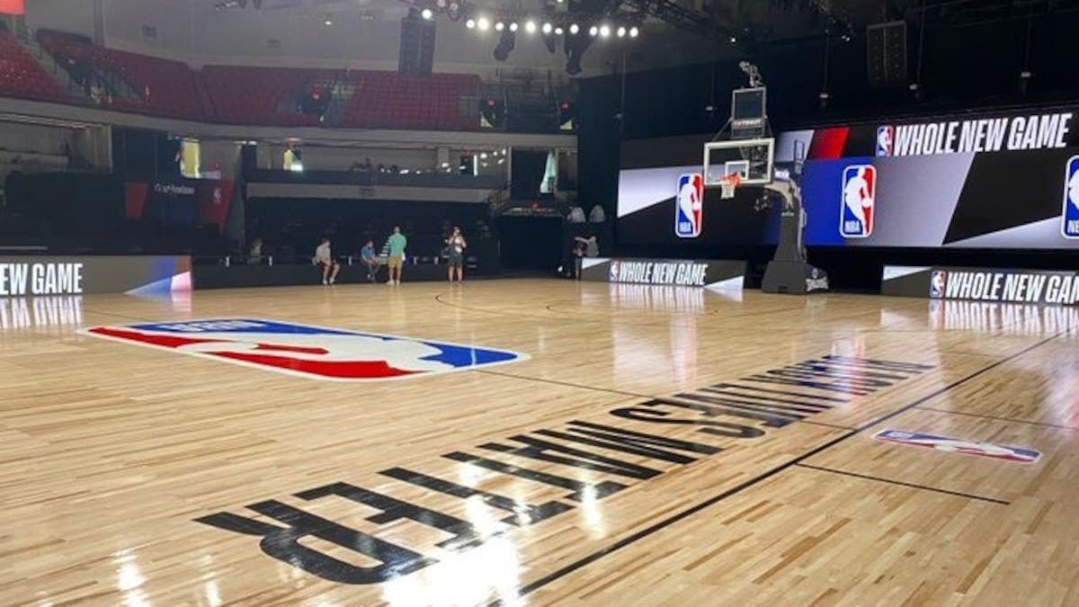 La NBA exhibió este martes el campo de juego dentro de ‘la Burbuja’, situada en Orlando (Florida), donde se jugarán los partidos de la Liga, y que tiene impresa con grandes letras la frase reivindicatoria ‘Black Lives Matter’.