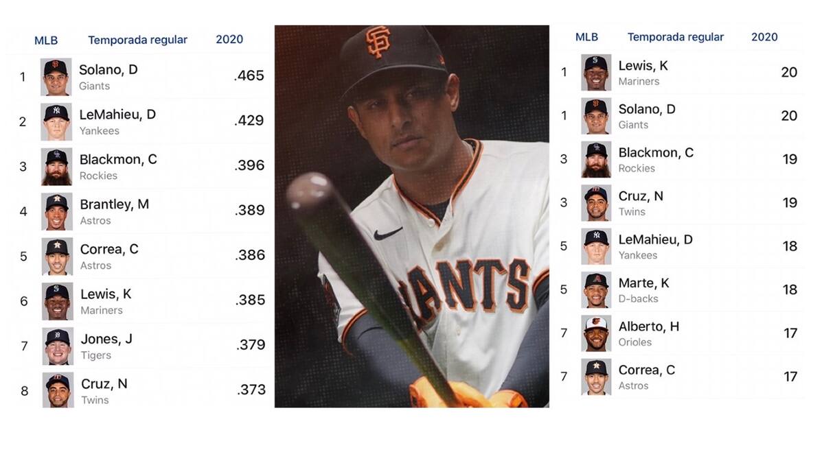 Solano, que el jueves se fue de 4-3, con dos dobles, en la derrota de la novena franciscana ante los Rockies de Colorado, por pizarra de 6-4, viene de tercero en el turno al madero (lugar reservado para los toleteros del line-up) porque sus números en el comienzo de esta temporada atípica lo tienen liderando varios apartados ofensivos en la Liga Nacional y en todas las Grandes Ligas.