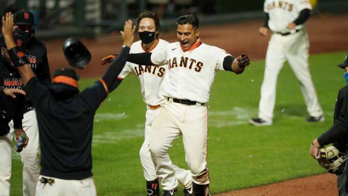 El utility colombiano Donovan Solano conectó el jonrón que selló la victoria en la undécima entrada y el primera base Brandon Belt dirigió el ataque con dos vuelacercas para los Gigantes de San Francisco, que vencieron 10-8 a los Dodgers de Los Ángeles, en el Oracle Park.