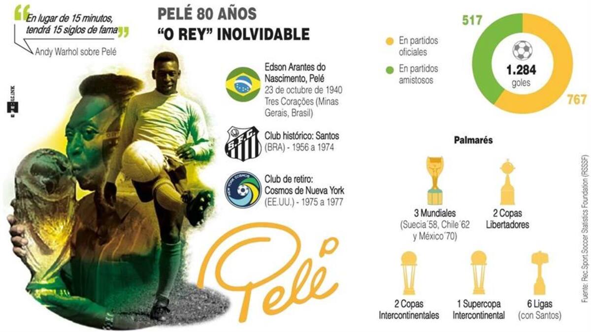 Marcó más de 1.000 goles en sus dos décadas de carrera profesional y ganó tres mundiales con Brasil (1958, 1962 y 1970), un hito que no ha logrado nadie hasta la fecha.