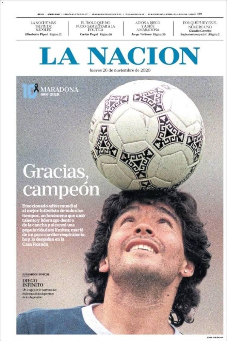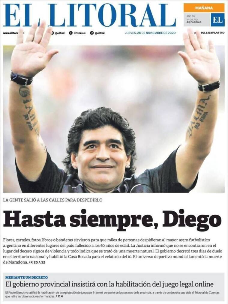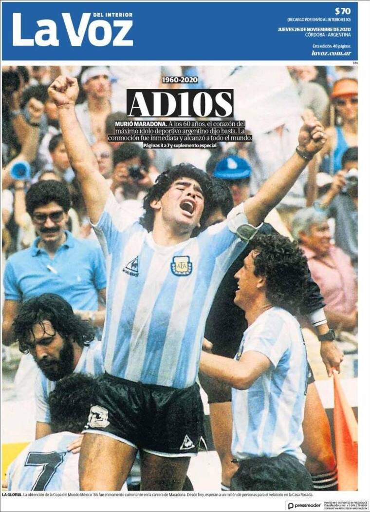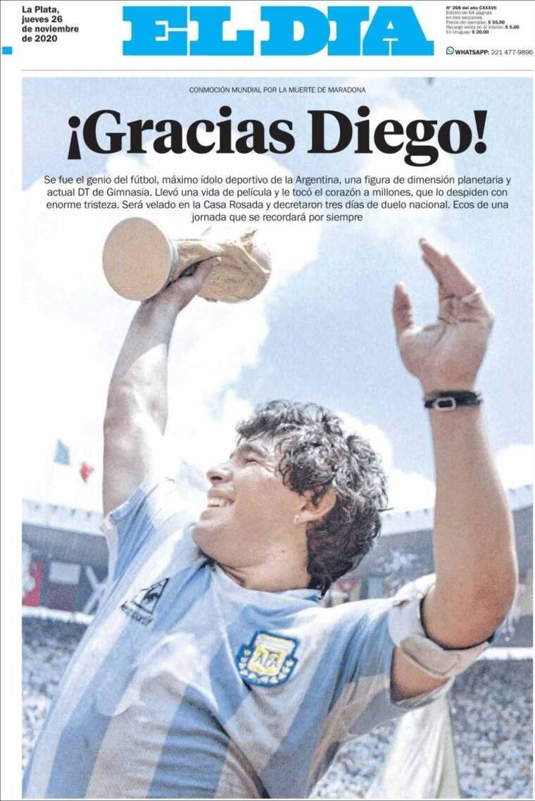 La prensa argentina se despidió este jueves de Maradona, dedicándole portadas enteras y con ediciones especiales en las que recuerdan sus hazañas.