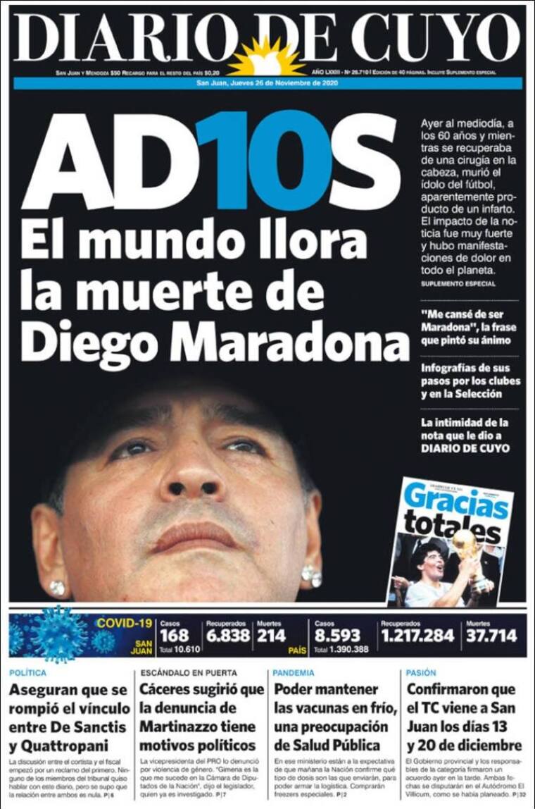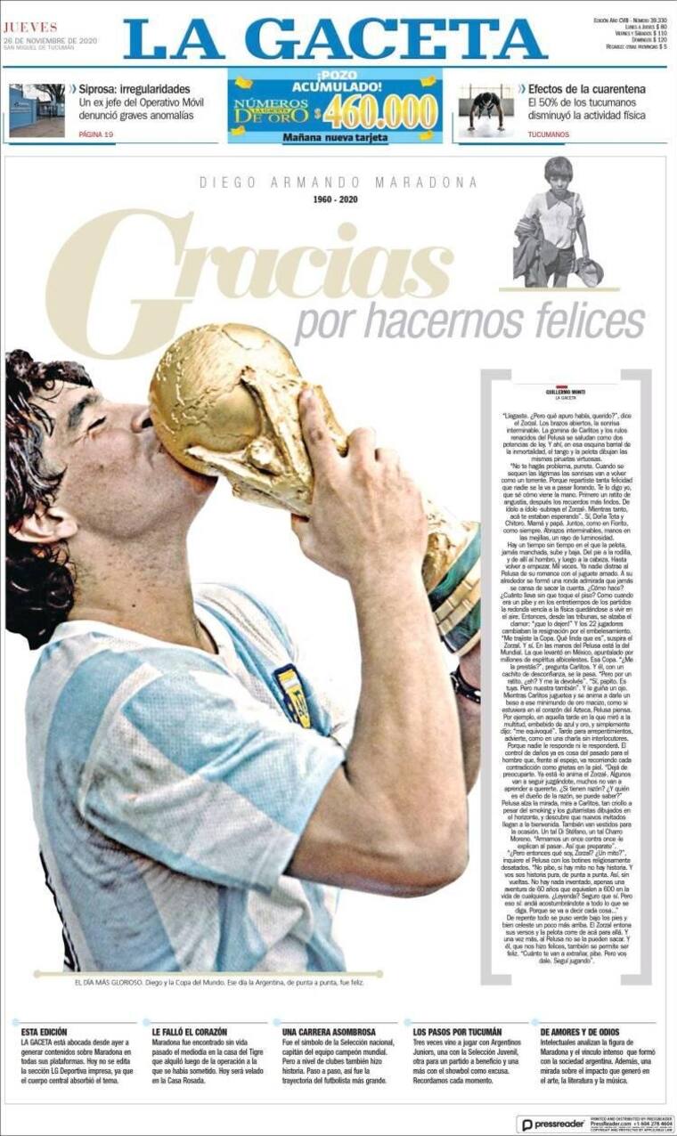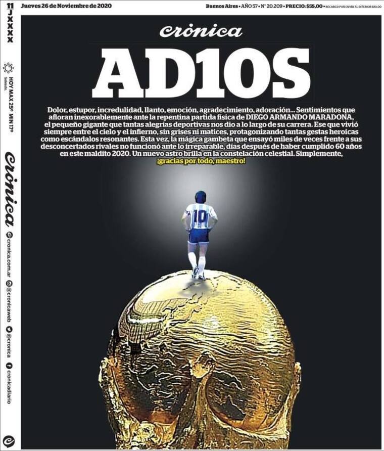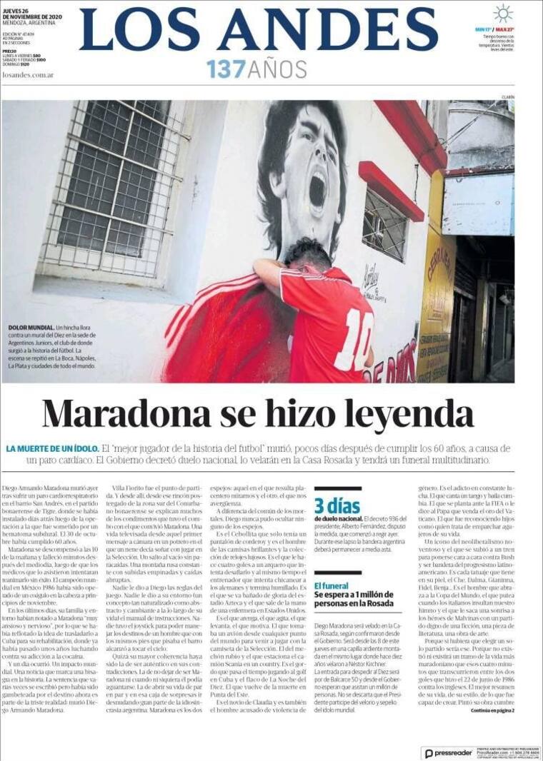 La prensa argentina se despidió este jueves de Maradona, dedicándole portadas enteras y con ediciones especiales en las que recuerdan sus hazañas.