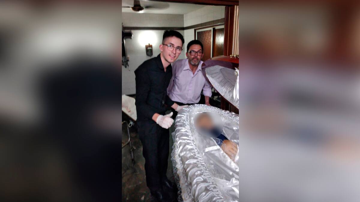Horas más tarde apareció en redes otra imagen en la que dos trabajadores, al parecer, encargados de preparar el cuerpo del eterno ‘10’, aparecen posando con el ataúd, completamente descubierto.