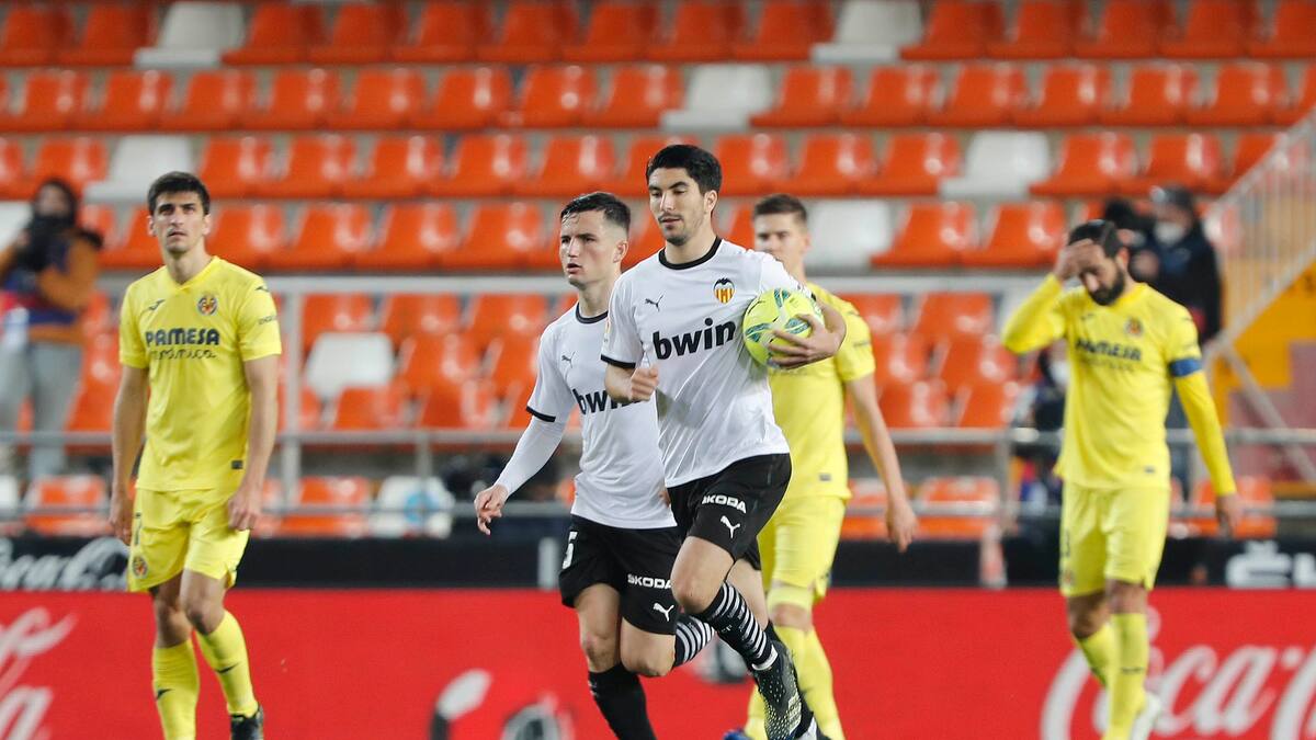 Un penalti transformado por Gerard Moreno a cinco minutos del descanso tras una mano de Gayà que revisó el árbitro a instancias del VAR adelantó al Villarreal, pero un penalti de Moi Gómez sobre Maxi Gómez propició el 1-1 transformado por Carlos Soler antes de que un gran zurdazo de Guedes en la prolongación dejara los puntos en Mestalla.