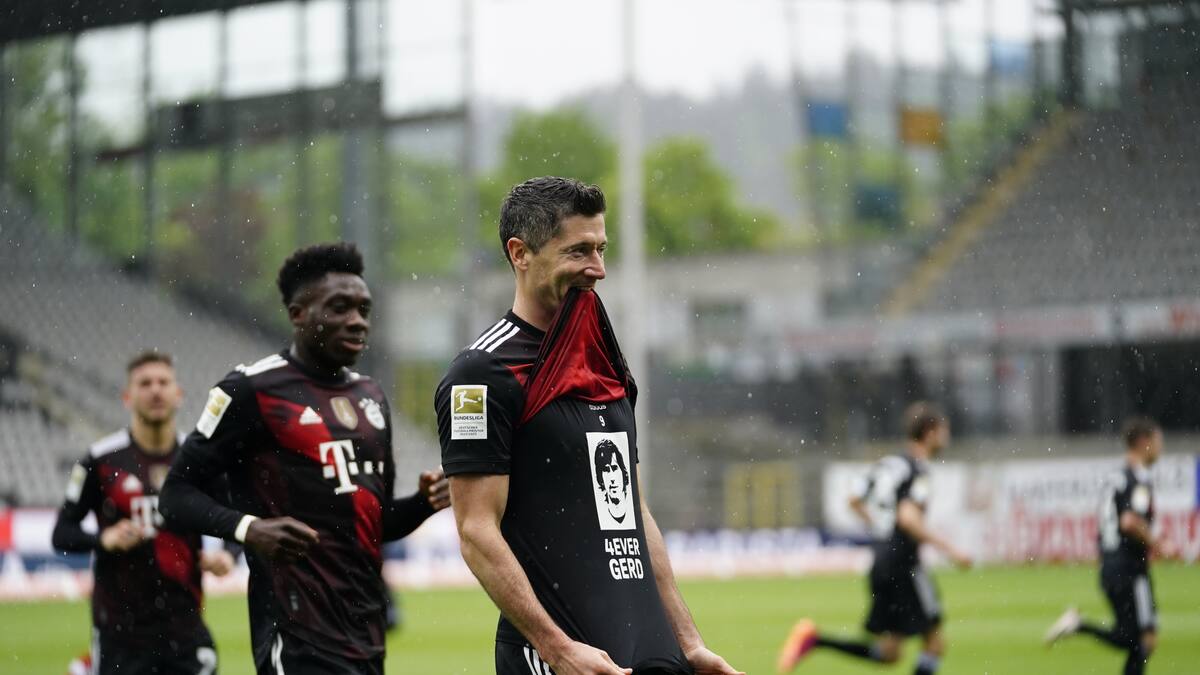 Lewandowski, al celebrar, se levantó la camiseta para buscar otra con una imagen de Gerd Müller y con una leyenda que decía en inglés '4 ever Gerd' .