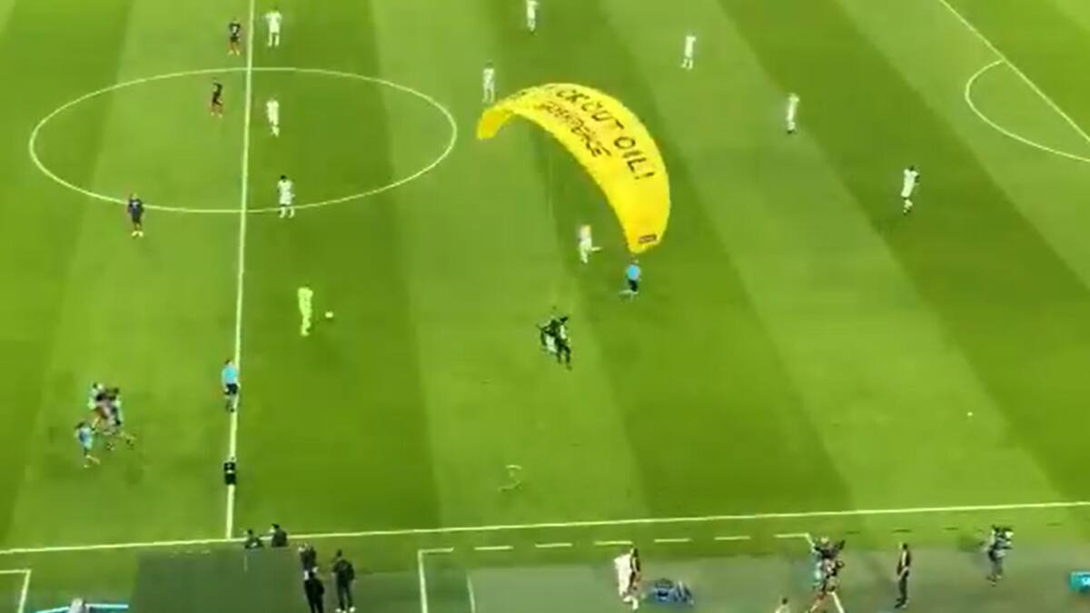 El hombre se encontraba sobrevolando el Allianz Arena en un paracaídas con un mensaje que decía ‘Kick out Oil’ (‘Fuera petróleo’, en inglés), pero al parecer se terminó enredando con el cable de la ‘Spider Cam’, la cámara aérea que cubre el partido.