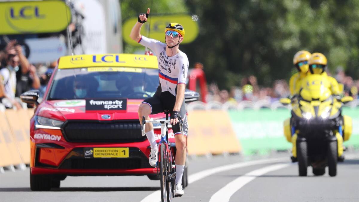 El esloveno cruzó la meta señalando el maillot de su equipo, el Bahrein, y haciendo el gesto de cerrar bocas, un día después de que la gendarmería francesa registrara su hotel por una investigación abierta por tenencia de productos dopantes.