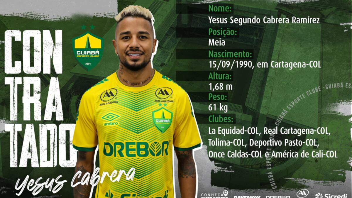 'Cuiabá cerró la contratación del mediocampista colombiano Yesus Cabrera, quien estuvo en América de Cali. El jugador de 30 años ya se encuentra en la capital de Mato Grosso y ha sido sometido a reconocimientos médicos y físico. Cabrera ya está integrado en el grupo de deportistas y aguarda la regularización de documentos para debutar con la camiseta de Auriverde, que solo tendrá lugar en agosto, cuando se abra la ventana de fichajes para el fútbol internacional', dijo el cuadro brasileño en un comunicado.
