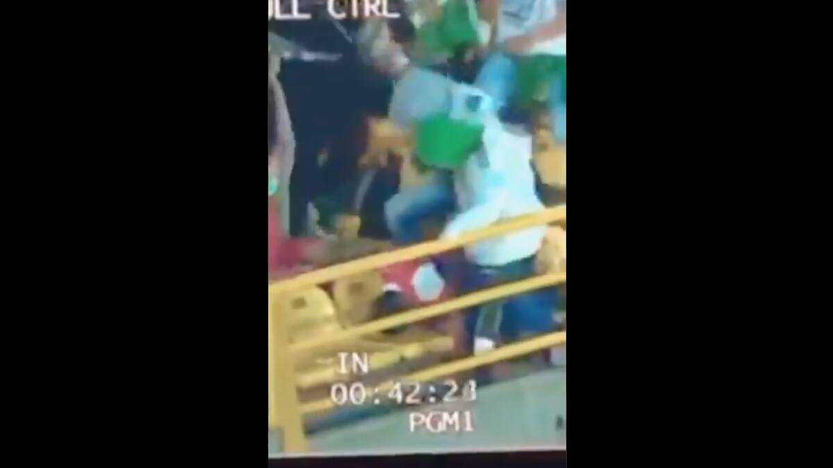 En medio de las sillas de las gradas, lo persiguen y lo golpean reiteradamente. A pesar de que en un momento queda inconsciente, lo golpean sin piedad en la cabeza.