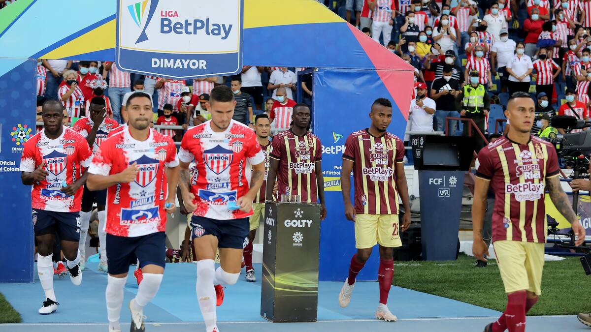Rojiblancos y vinotintos saltaron al campo de juego después que los himnos de Colombia y Barranquilla sonaron a través del sistema de amplificación del estadio.