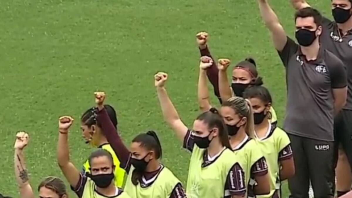 Las futbolistas Brasileras decidieron levantar su puño y enviar un mensaje de lucha contra el racismo, ya que algunas integrantes del equipo de Montevideo fueron acusadas de lanzar insultos discriminatorios contra las futbolistas del Corinthians en un juego anterior.