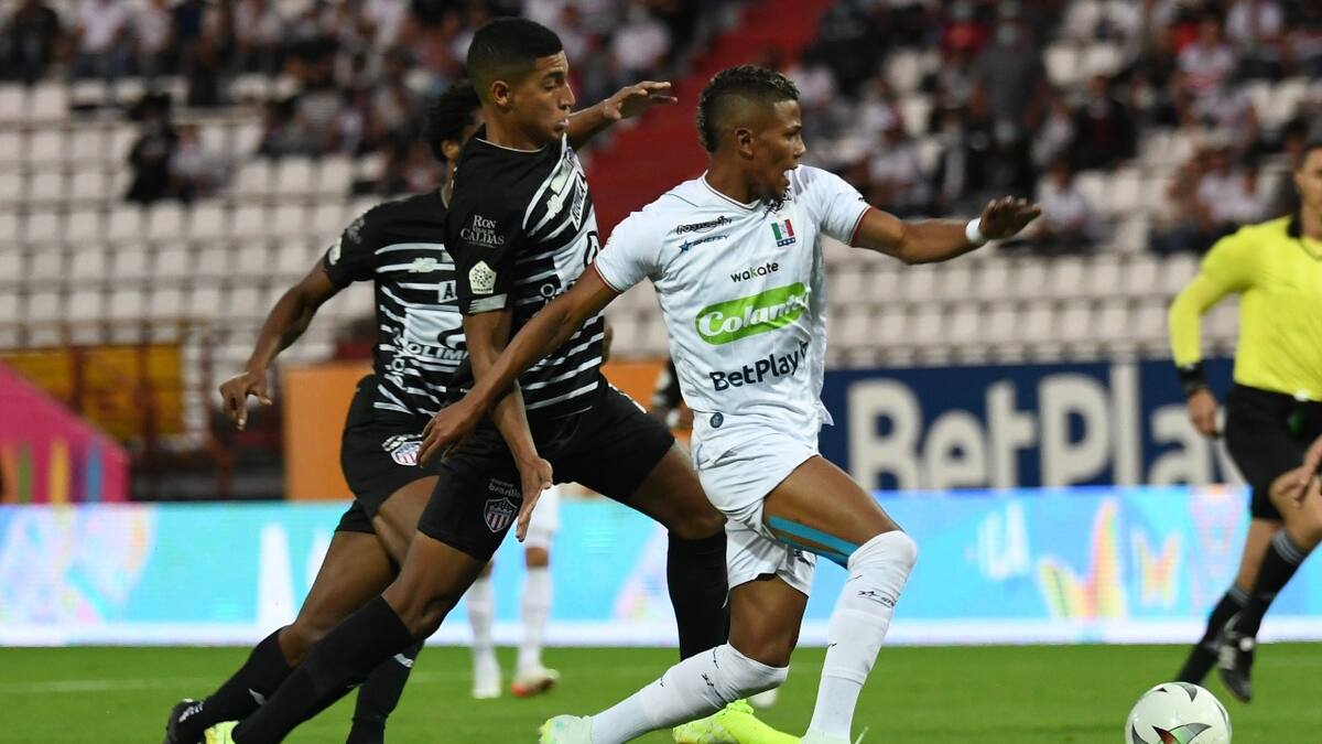 90. Miguel Borja recibe para quedar mano a mano con el arquero albo, intenta eludirlo, pero falla, la pelota vuelve a quedar en su poder, dejan en el camino a un rival y saca un remate que pasa cerca del arco blanco.