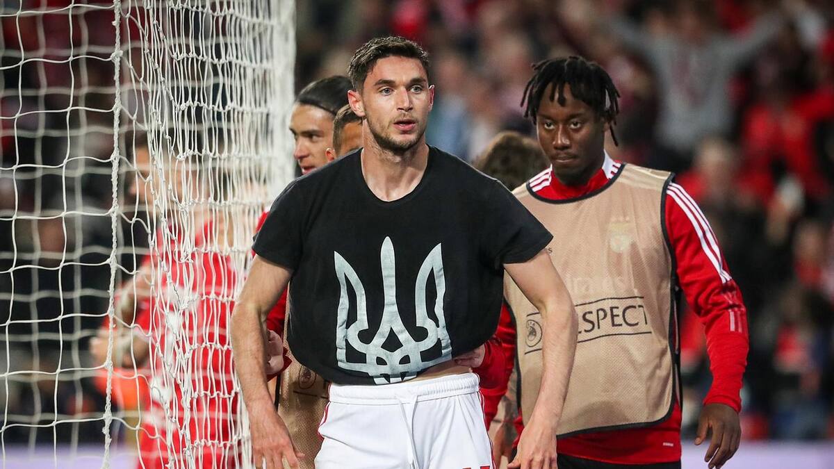 La presente Champions ha ofrecido el primer gran gesto público de apoyo a Ucrania. Anoche, en el estadio lisboeta de La Luz, Roman Yaremchuk, internacional ucraniano delantero del Benfica, marcó ante el Ajax en el partido de ida de octavos de final y mostró bajo la camiseta encarnada benfiquista otra en la que dejó ver el escudo de su país, el 'tridente ucraniano' símbolo de la república, y lo besó.