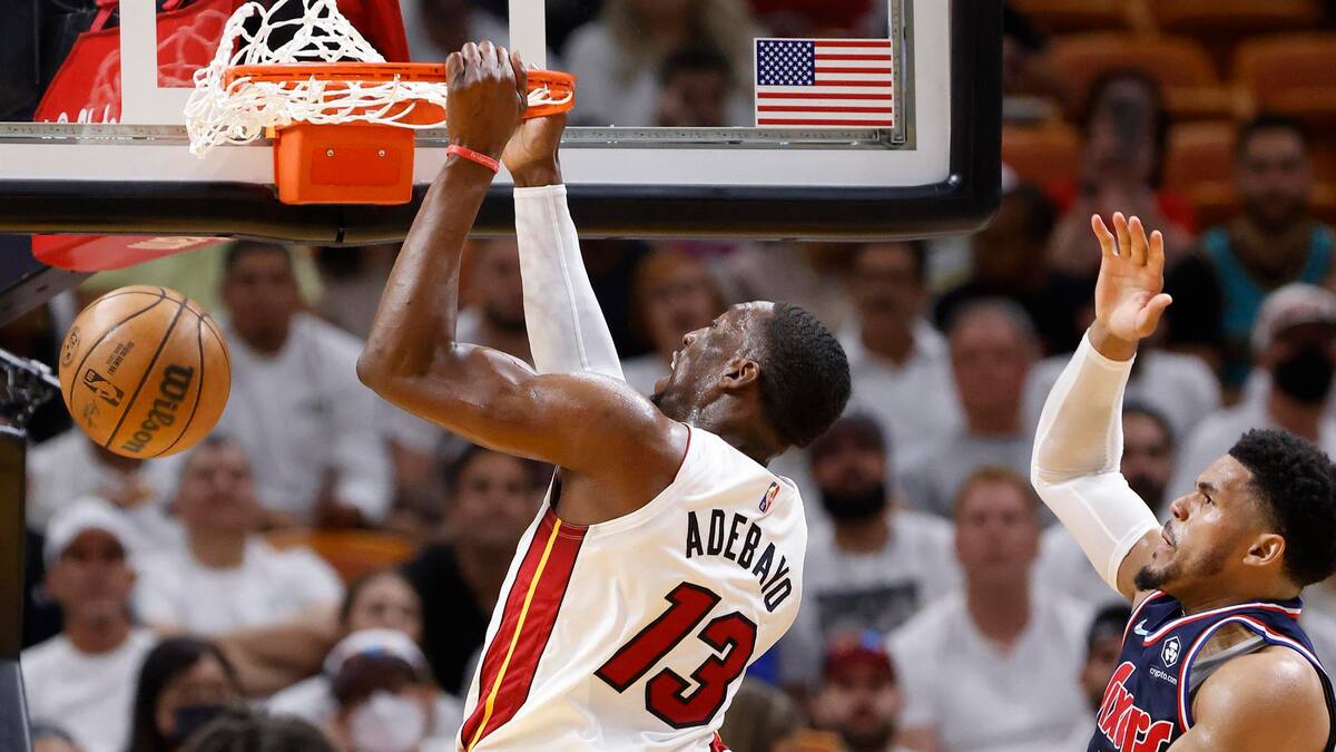 El pívot de los Heat anotó diez puntos y capturó seis rebotes solo en el primer período, una señal de poderío frente a unos 76ers que tardaron en acostumbrarse a la ausencia de Embiid, su tótem en la pintura.