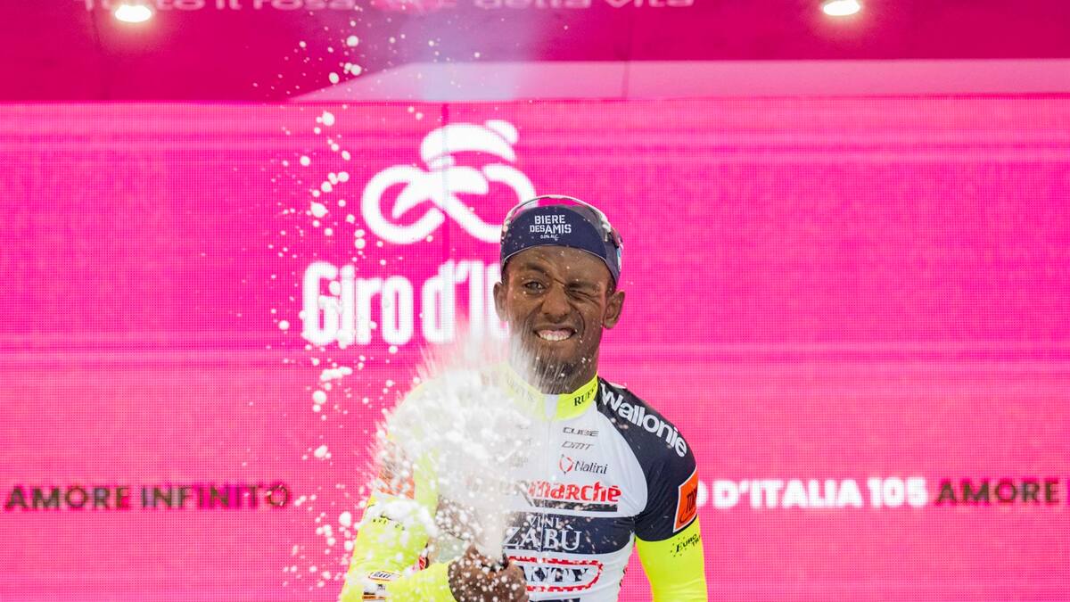 Biniam Girmay, de 22 años, recibió las flores e inmediatamente se inclinó para descorchar el vino espumoso reservado para el ganador.