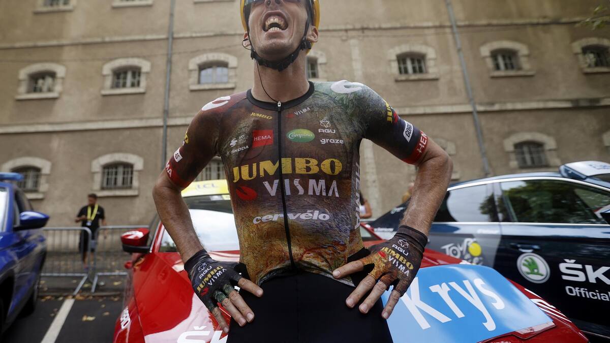 El gigante de 1,91 metros se estrenó en el Tour y suma 23 victorias en su palmarés. Como esta de Cahors, ninguna, razón de peso para celebrarlo con un buen vino de la tierra del Departamento del Lot. La fiesta nunca se para en el Jumbo Visma.