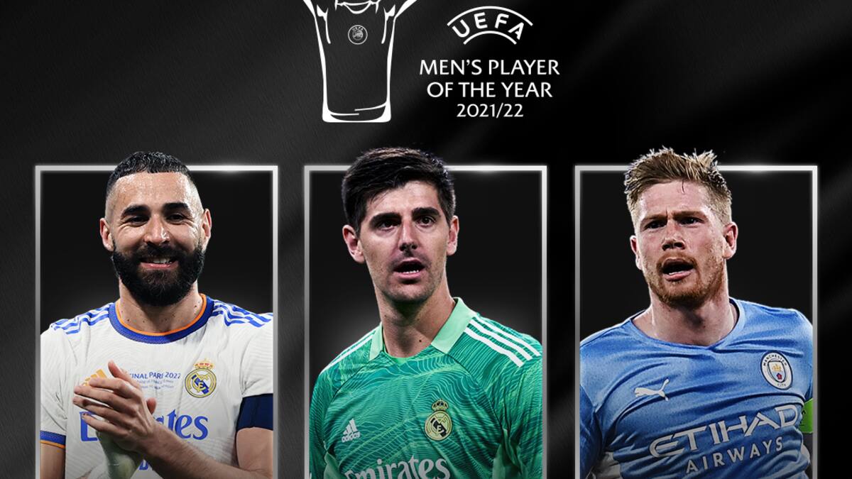 Los madridistas Karin Benzema y Thibaut Courtois, así como Kevin De Bruyne, centrocampista belga del Manchester City, son los tres nominados finales al premio de Jugador del Año de la Uefa 2021/22.