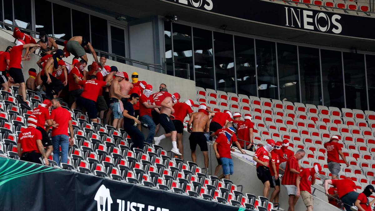 Un grupo de hinchas alemanes encapuchados han atravesado una parte de las tribunas para dirigirse a la zona donde están los ultras del Niza.