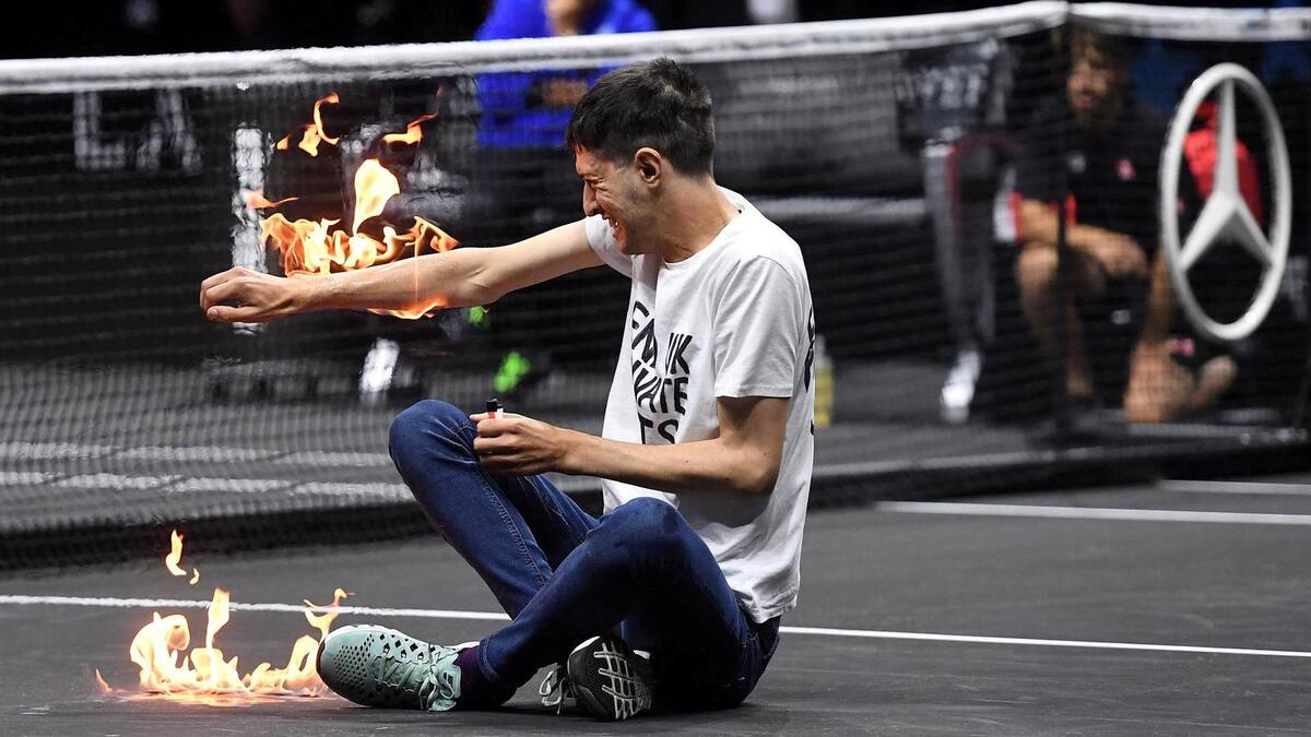 Un espontáneo saltó a la pista donde se disputa la Copa Laver y se prendió fuego en un brazo, como señal de protesta contra el uso de vuelos privados en el Reino Unido.