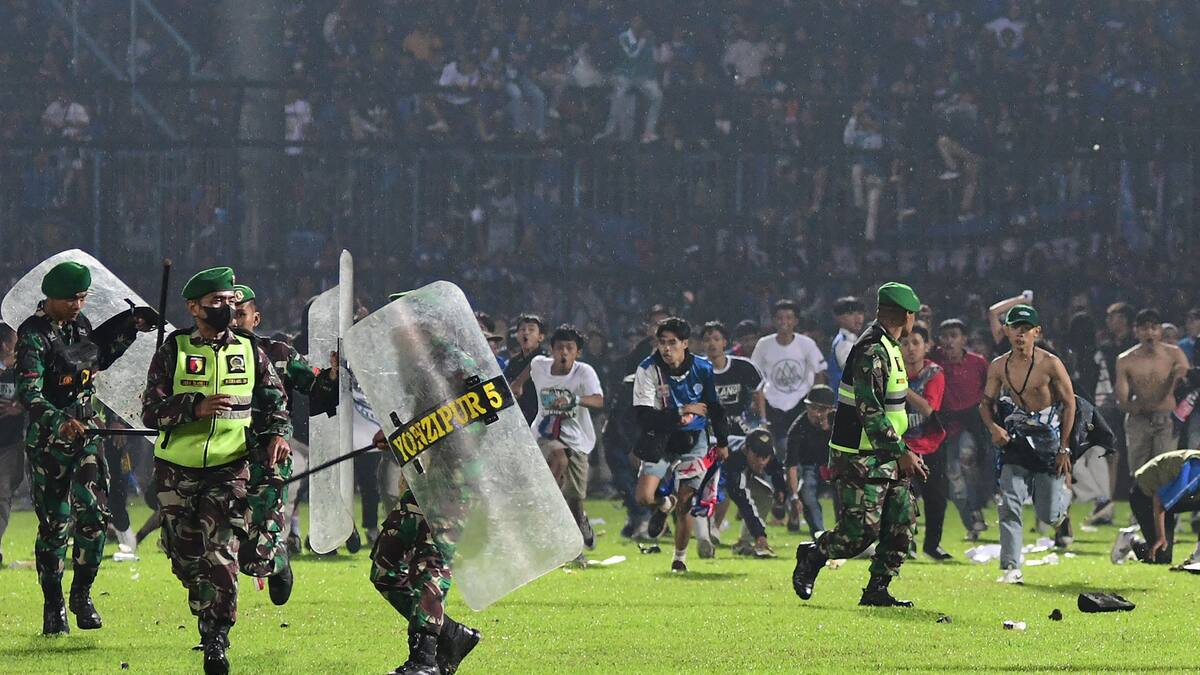 Después de que perder por 2-3, los aficionados del Arema bajaron al campo, lo que provocó enfrentamientos con la policía, que respondió con porras y gases lacrimógenos, causando una estampida de miles de personas.