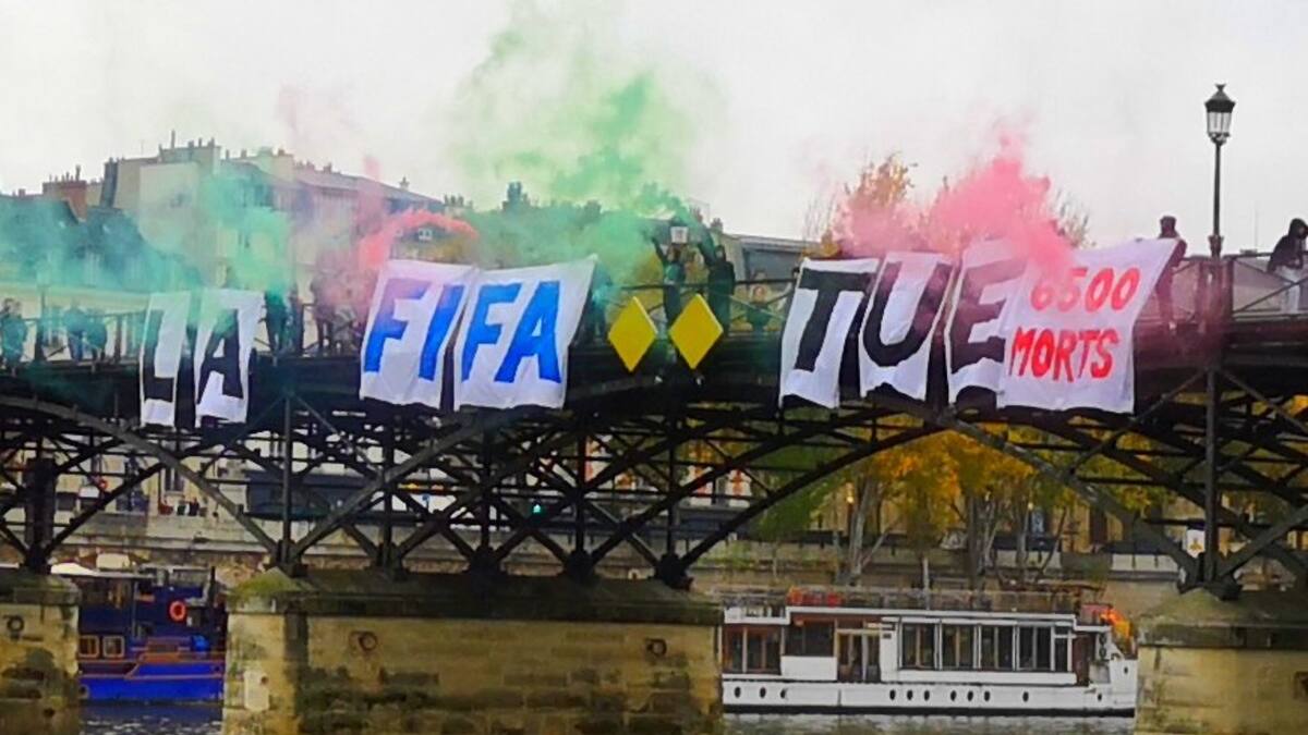 En torno al medio día, un grupo de activistas colgó la pancarta 'La FIFA mata. Copa del Mundo 2022: 6.500 muertos' durante breves minutos en el Pont des Arts, uno de los puentes más famosos que surcan el río Sena de París.