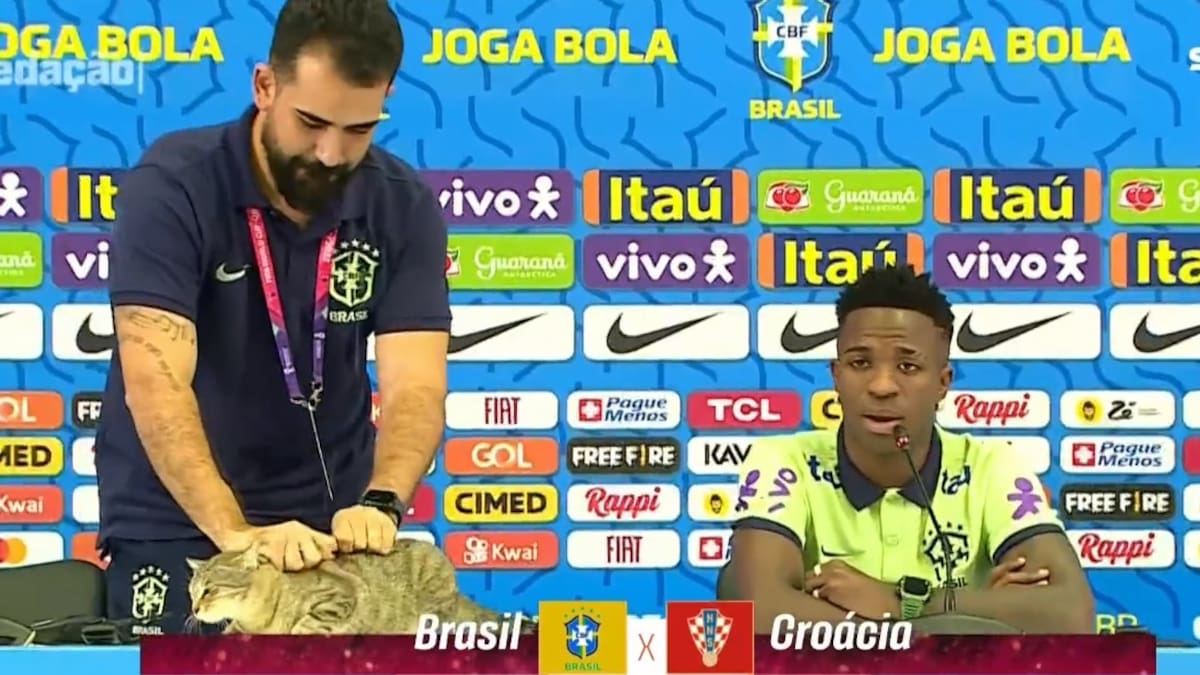 Un gato se coló en la sala de prensa de la concentración de la selección brasileña mientras Vinicius Junior atendía a los medios de comunicación este miércoles.