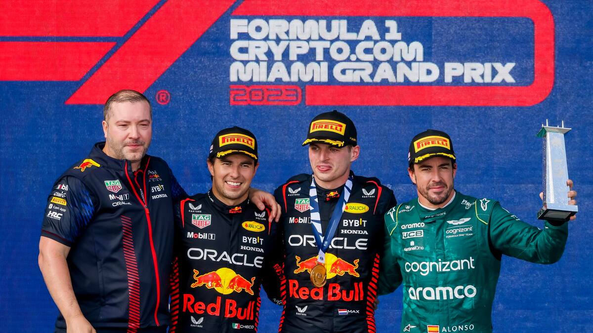 El neerlandés Max Verstappen (Red Bull) reforzó su liderato en el Mundial de Fórmula Uno al ganar este domingo el Gran Premio de Miami (EEUU), el quinto del año, disputado en el circuito construido en torno al Hard Rock Stadion de la citada localidad del estado de Florida; donde relegó al segundo y al tercer puesto -respectivamente- a su compañero, el mexicano Sergio Pérez, y al español Fernando Alonso (Aston Martin), que logró su cuarto podio de la temporada: el 102 en la categoría reina.