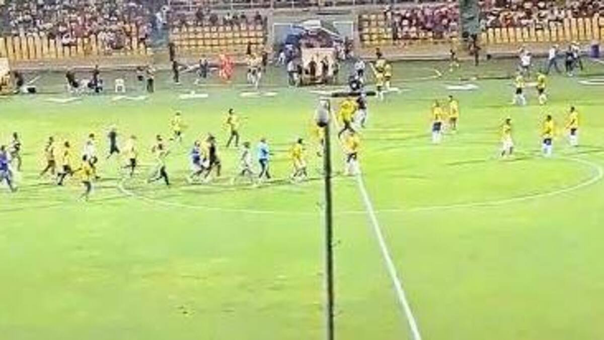 A los 37 minutos del partido, con el encuentro 2-0 a favor de Fortaleza, un grupo de aproximadamente 50 fanáticos del conjunto heroico saltaron al gramado del escenario deportivo para increpar y reclamarle a los futbolistas.