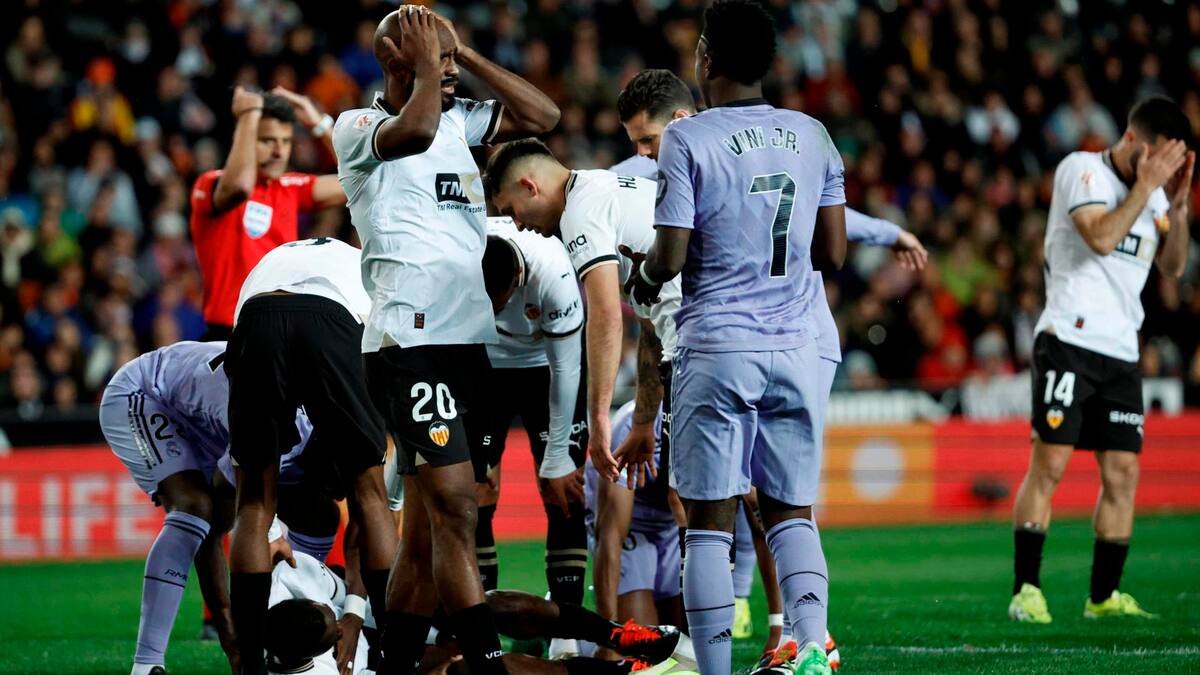 El defensa central del Valencia Mouctar Diakhaby ha tenido que ser retirado en camilla del césped de Mestalla y podría sufrir una grave lesión en la rodilla derecha después de que una acción fortuita el madridista Aurelien Tchouameni cayera encima de la pierna del defensor en el minuto 88 del partido.