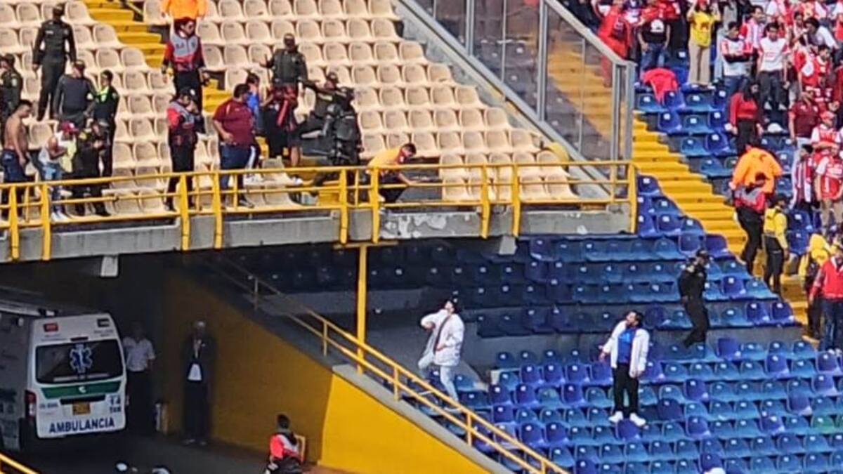 Los hinchas del Tolima arrancaron sillas y las lanzaron hacia abajo buscando agredir a los aficionados anfitriones y a los miembros de la Fuerza Pública, que logró detener a varios de los revoltosos.