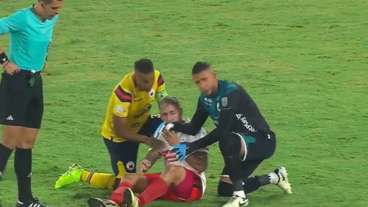 En pleno juego de la jornada 17 del fútbol profesional colombiano, a Holgado tuvieron que acomodarle un dedo en pleno campo de luego de sufrir una caída que le provocó una sensible lesión.