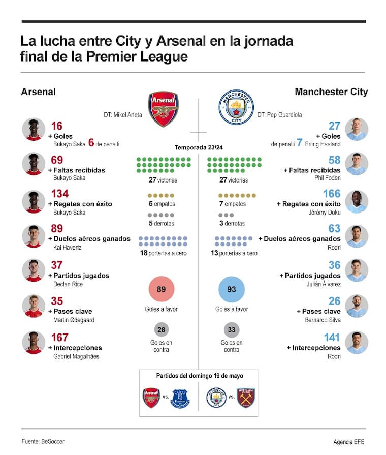 Si el City llega a ser campeón sería su cuarto título consecutivo de Premier, algo inédito en la competición. Si el que grita campeón es el Arsenal, estará rompiendo una sequía de 20 años. Su último título liguero se remonta a la temporada 2003-2004, cuando aquel equipo invencible de Arsene Wenger, liderado en el campo por los franceses Thierry Henry y Robert Pirés, escandiló al mundo con un buen juego.