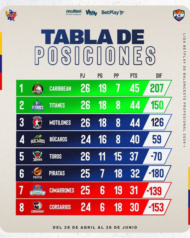 Mientras que en la cuarta casilla está ubicado Búcaros, con dos partidos menos que Titanes —se pondrá al día este jueves y viernes—, lo que lo hace un rival directo en esa lucha por conseguir la clasificación directa. En caso de un hipotético empate entre ambos equipos al cierre de la fase regular, el quinteto currambero ganará la posición por mejor diferencia.