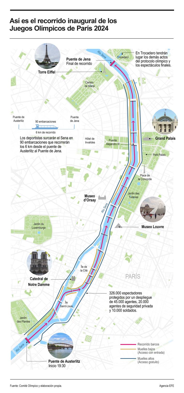 Las miradas del mundo estarán este viernes en París, cuando comiencen a desfilar por el río Sena los barcos que transportarán a los deportistas olímpicos hasta los pies de la torre Eiffel, en una espectacular ceremonia de apertura que, por primera vez, no tendrá como escenario un estadio.